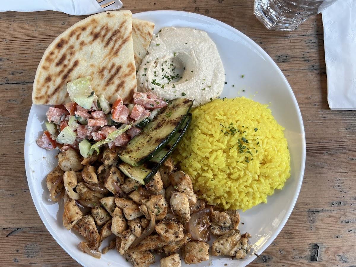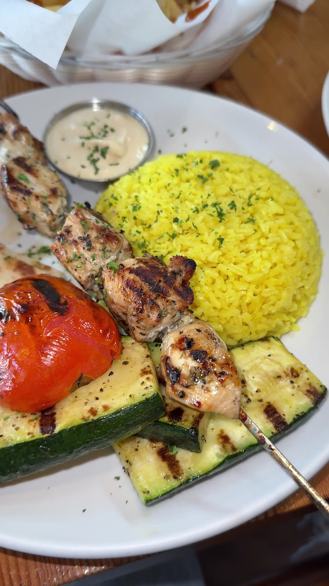 My fiancé and I dropped by around 7 PM on a Friday. Surprisingly, the place was quiet with plenty of space to choose from. Opting for an indoor table by the window, we quickly dove into their extensive Greek menu. I went for the garlic fries and a large gyro wrap, while my fiancé chose the hummus and chicken souvlaki. The souvlaki was flavorful but a tad too lemony for our taste. The hummus was solid – exactly what you'd expect. The highlight? The garlic fries. A generous portion that was perfectly crispy on the outside and soft on the inside, served with an incredibly spicy green hot sauce and a milder red sauce. We hit a small snag when my gyro was mistakenly delivered to another table, but the staff quickly fixed the issue and kindly removed it from our bill. Overall, our experience was positive and the food exceeded our expectations. We're definitely coming back for more, especially the gyros, and are excited to explore the rest of the menu